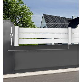 Module de clôture ajouré de hauteur 42 cm, à lisses horizontales biseautées permettant de laisser passer l'air tout en conservant votre intimité. En PVC blanc, il est très facile à entretenir. Le poteau fourni est renforcé par un tube carré en acier galvanisé sur platine. Disponible en blanc uniquement, également en hauteur 55 et 185 cm. La clôture ajourée 42 cm est fabriquée en France, vendue à prix d'usine et garantie 2 ans. N'oubliez pas d'acheter également un poteau d'arrêt pour terminer la pose de votre clôture. Le module de clôture horizontale ajourée hauteur 42 cm est utile comme brise-vue. Il se fixe très facilement.
