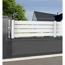 Module de clôture ajouré de hauteur 55 cm, à lisses horizontales biseautées permettant de laisser passer l'air tout en conservant votre intimité. Il peut être utilisé comme un brise-vue, fixez-le simplement sur un muret et obtenez une séparation efficace et esthétique. En PVC pour un entretien facilité, il est également recoupable. Vendu avec un poteau renforcé par un tube carré en acier galvanisé sur platine. Disponible en blanc uniquement, également en hauteur 42 et 185 cm. La clôture ajourée 55 cm est fabriquée en France, vendue à prix d'usine et garantie 2 ans. N'oubliez pas d'acheter également un poteau d'arrêt pour terminer la pose de votre clôture.