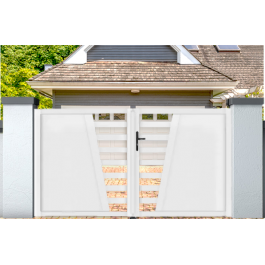 Le portail en PVC modèle Cambrai est personnalisable dans vos dimensions au centimètre près ! Quincaillerie réglable, accessoires de pose inclus, cadre en aluminium intégré. Son esthétique est l'une des plus originale, avec des vantaux en V, mi-pleins mi-ajourés. Il est disponible en blanc uniquement. Il est possible de le motoriser. Gond inférieur à visser.